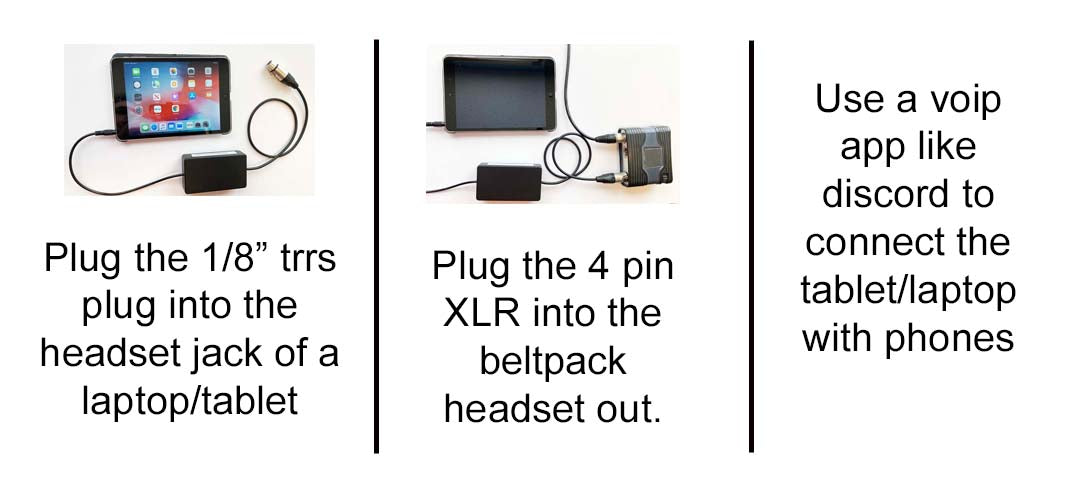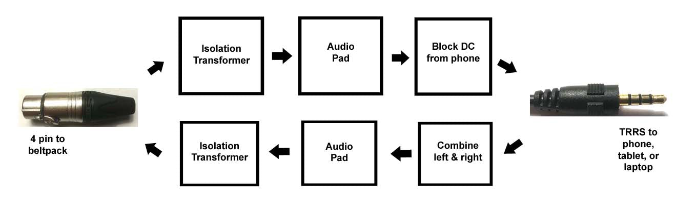* Interface a com beltpack to any device with an 1/8" (3.5mm) TRRS jack, such as phones, tablets or laptops
